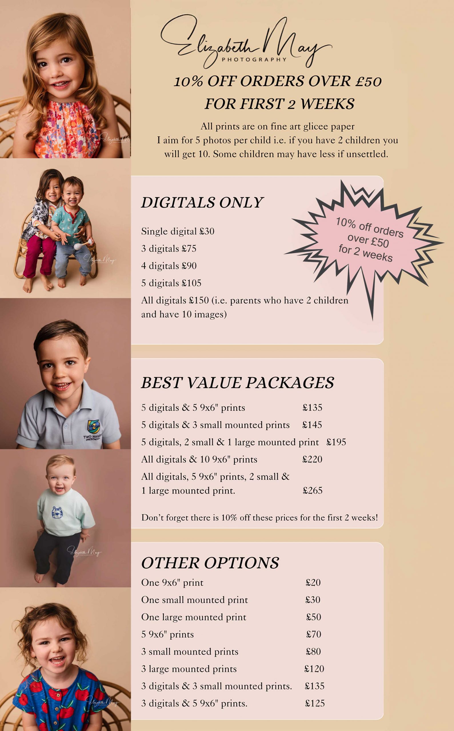 Please note that my print prices are a little higer than usual school photographers as I only offer fine art prints, samples of which I leave at reception of the nursery after photo day for you to see.